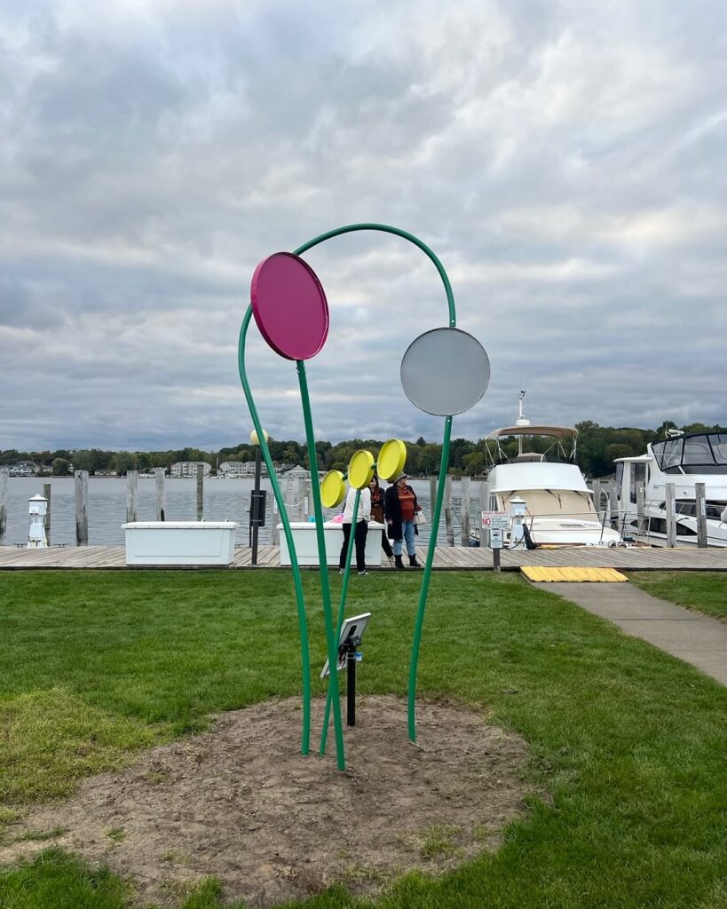 Based in Michigan, Jeffrey Augustine Songco is known for exploring themes of identity, celebration, and spectacle in his work. “My work blends pop culture with conceptual depth to investigate and celebrate human relationships, power dynamics, and the construction of shared knowledge.” Flower World represents his first outdoor installation in Saugatuck.